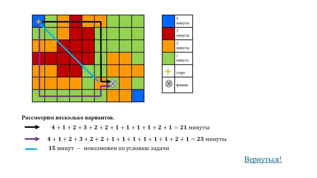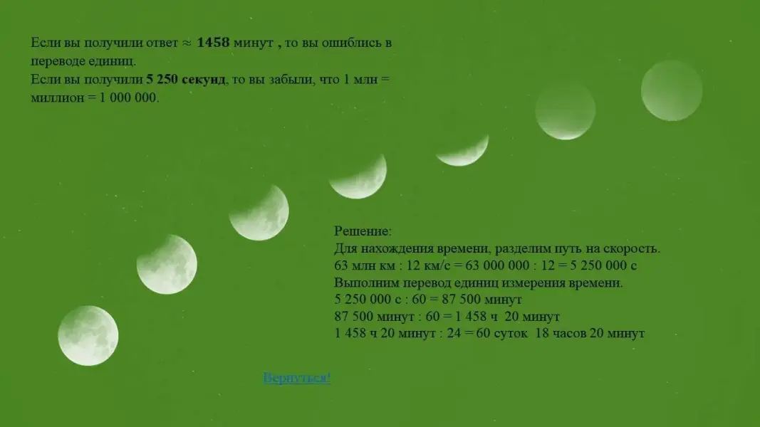 5. Оценка возможных ошибочных решений. Для меня данный этап является самым интригующим. Сказка-путешествие или квест предполагают развитие сюжета в зависимости от действий участников. И здесь немаловажно сделать так, чтобы сюжет не казался слишком тривиальным. Даже при создании заданий в виде тестов можно подобрать ответы так, чтобы они не были сразу очевидными. А для этого необходимо понимать, какие ошибки могут допустить учащиеся и включить в перечень предлагаемых ответов именно те, которые могут показаться правильными. Например, в первом и во втором заданиях приведенной ниже сказке, учащийся мог допустить ошибку в переводе единиц, поэтому в предлагаемых ответах и появляются соответствующие варианты. При этом, большим плюсом будет исполнение разветвление сказки при неправильном ответе. Когда участник даёт, выбирает, неверный ответ, то сказка перемещает его на страницу, где есть разъяснения и даёт шанс решить задание ещё раз. Как показывают некоторые исследование наличие такого шанса достаточно важно. Именно, по этой причине во многих играх, есть «жизни», позволяющие допускать ошибки.