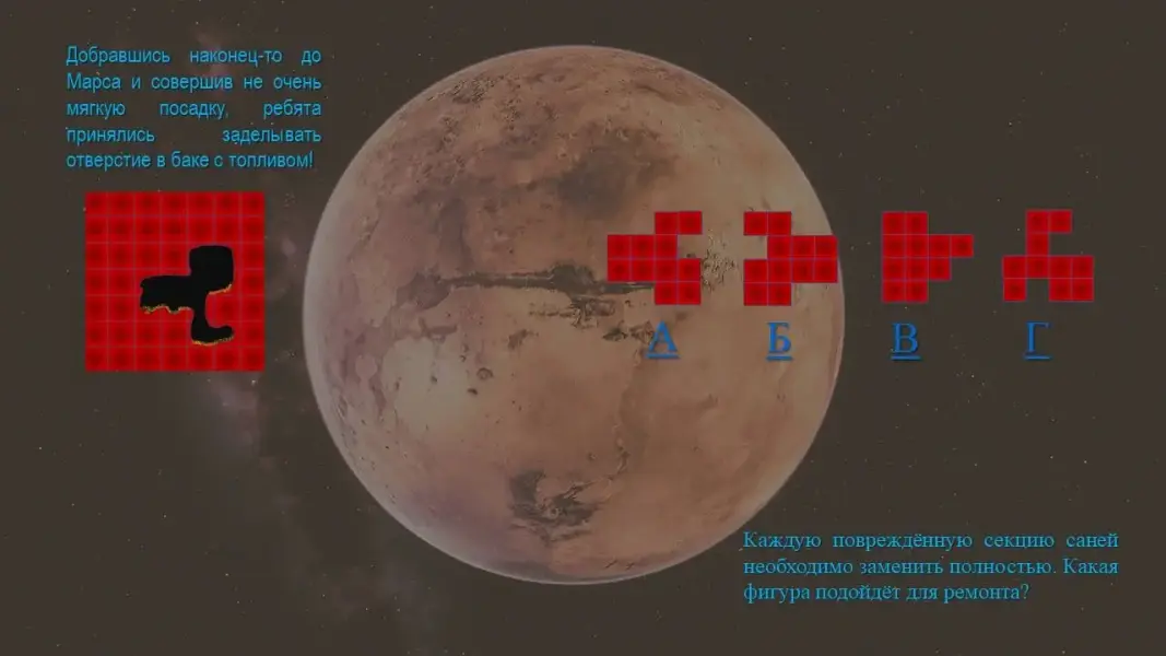 1. Идейный. Учитывая события, столь ярко освящаемые в прессе, можно выбрать довольно много сюжетов. Меня привлёк запуск спутников и планирующий полёт к Марсу. Таким образом была выбрана единая тематика всех задач, их канва.