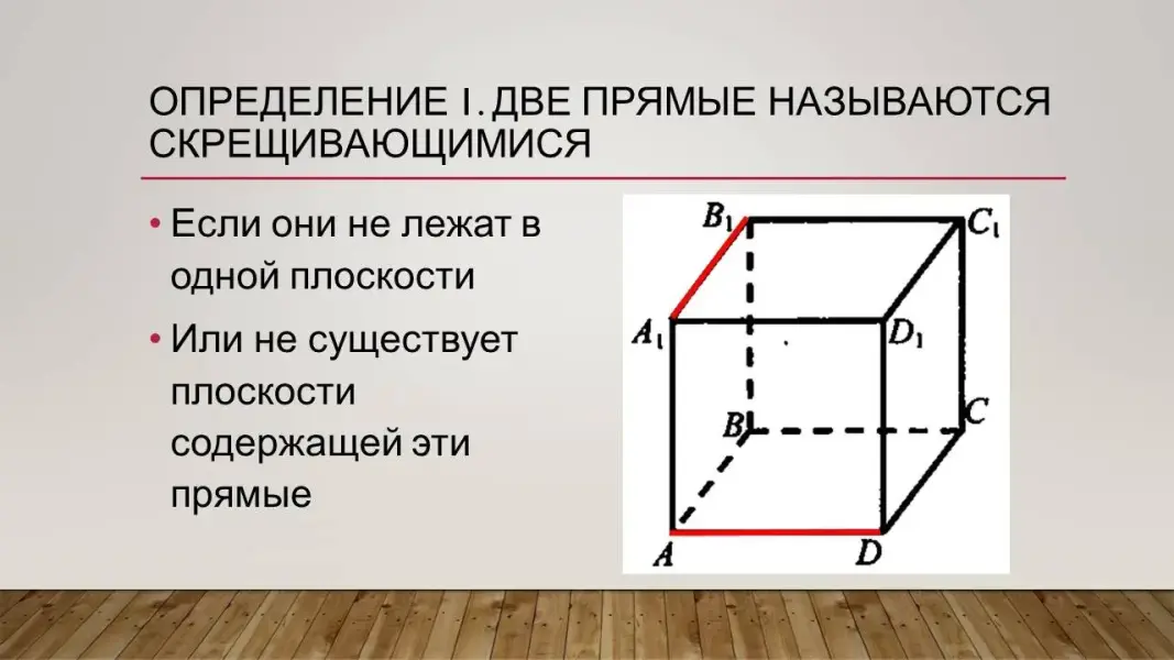 После решения задачи преподаватель говорит, что это новый вид прямых (те, которые в задаче не пересекаются и не параллельные) Они называются скрещивающимися.