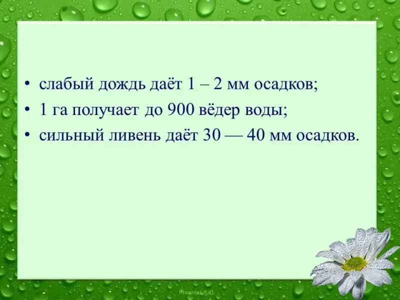 Но для полей это количество влаги имеет большое значение - при таком дожде 1 га получает до 900 вёдер воды. Во время сильного ливня выпадает 30-40 мм осадков. Представляете сколько это будет воды!