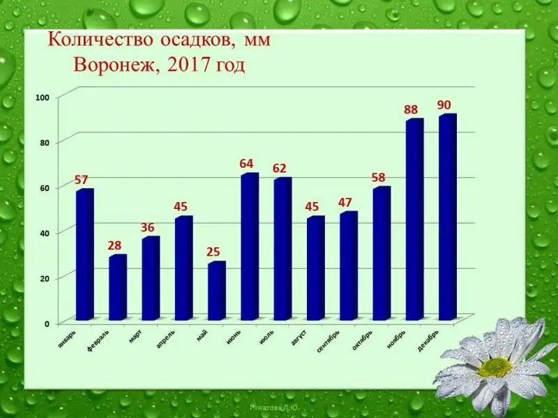 Перед вами диаграммма количества осадков по месяцам выпавших за 2017 год в Воронеже.