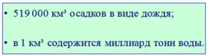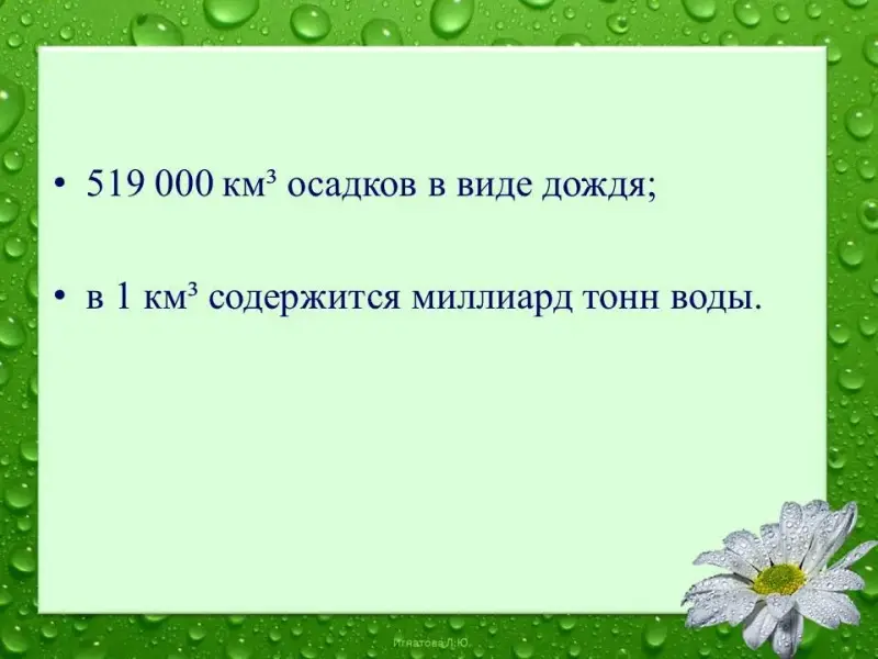 Учащийся: Заканчивая выступление нашей группы, хотим сказать, что каждый год на землю выпадает 519 000 км³ осадков в виде дождя.