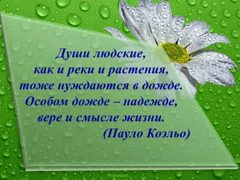 Учащийся: Удивительные минуты дарит музыка дождя тем, кто хочет ее услышать: она позволяет почувствовать не только гармонию с природой, но и гармонию с самим собой. Потому что в такой момент мы становимся лучше, чище, забываем обиды и негодование, прощаем свои и чужие ошибки, понимая, что все и так прекрасно…