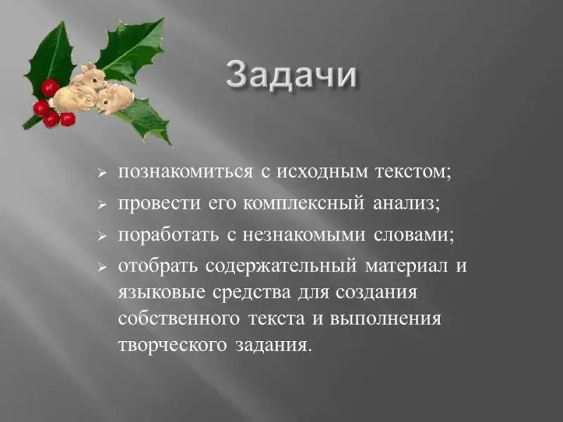 - отобрать содержательный материал и языковые средства для создания собственного текста и выполнения творческого задания. (Слайд 2)
