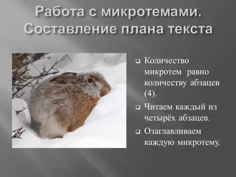 Текст читается вслух учащимися по абзацам, совместно определяются четыре микротемы текста; устанавливается, что количество микротем соответствует количеству абзацев в предложенном тексте.