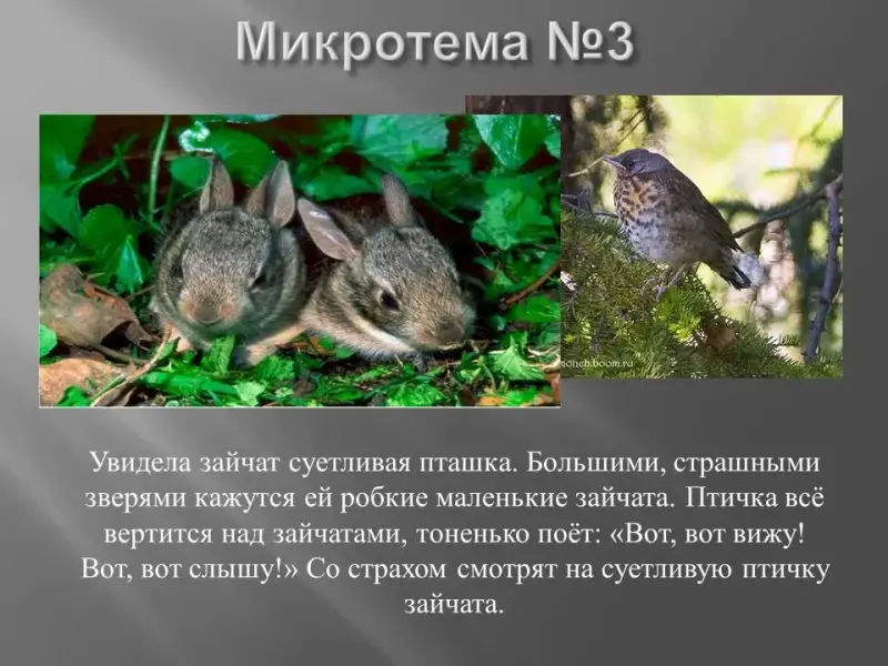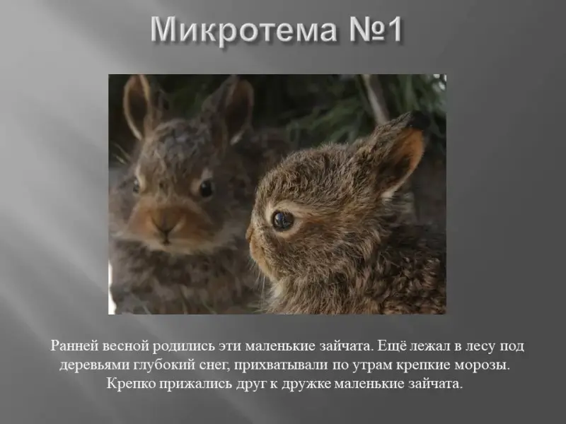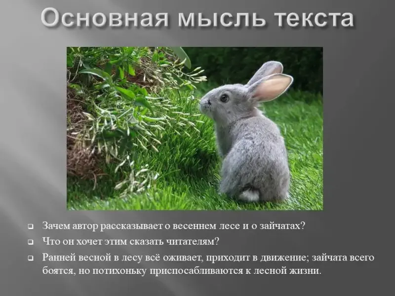 Учитель. Сформулируйте основную мысль текста. Для этого задайте вопросы: зачем автор рассказывает о зайчатах? что он хочет этим сказать? (Слайд 18)