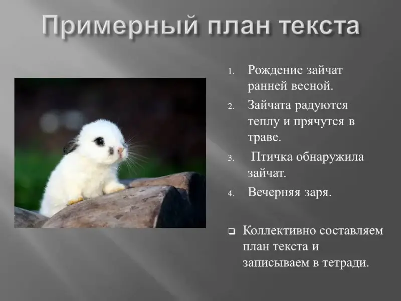 3. Учащиеся коллективно составляют план текста и делают записи в тетрадях. (Слайды 5-10)
