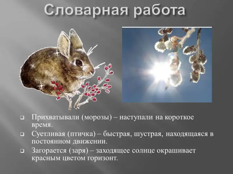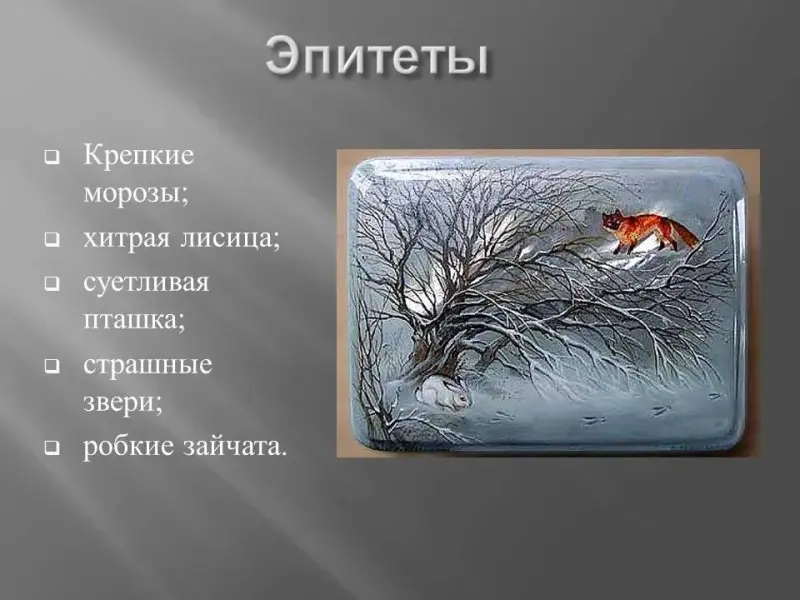 - Эпитеты: крепкие морозы; хитрая лисица; суетливая пташка; страшные звери; робкие зайчата.