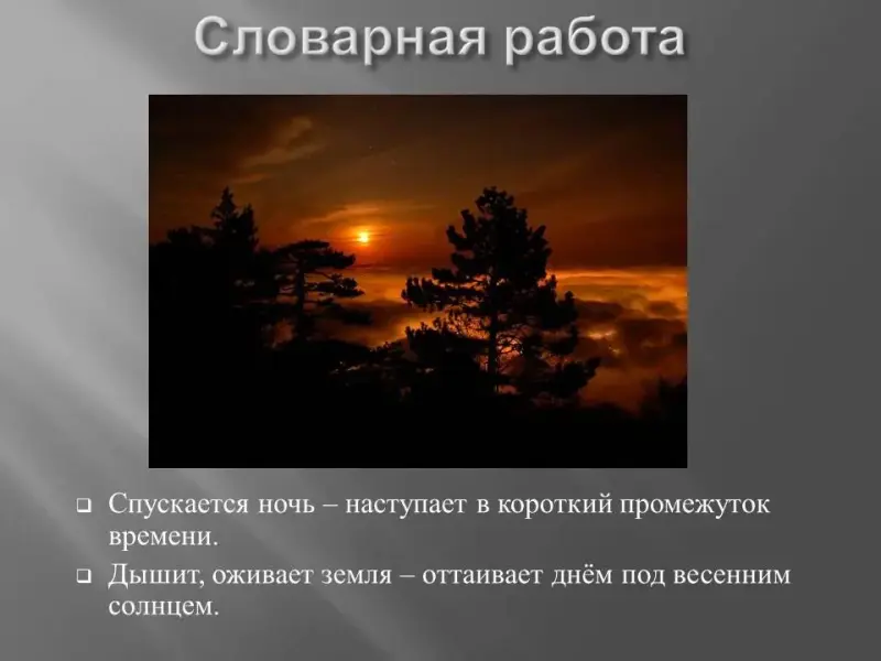 - Спускается ночь - наступает в короткий промежуток времени.