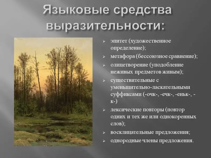 - Повторение языковых художественных средств и их кратких определений: эпитет (художественное определение), метафора (бессоюзное сравнение), олицетворение (уподобление неживых предметов живым), слова с уменьшительно-ласкательными суффиксами (-очк-; -ечк-; -ат-; -еньк-), лексические повторы (повтор одних и тех же или однокоренных слов), восклицательные предложения, однородные члены предложения.