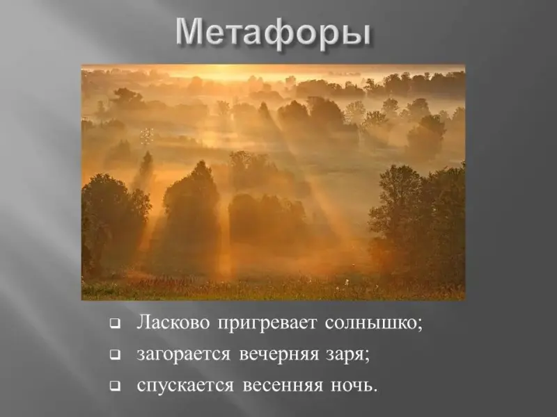 - Метафоры: ласково пригревает солнышко; загорается вечерняя заря; спускается весенняя ночь.