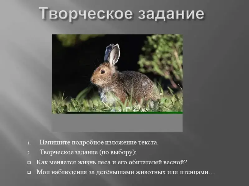 Учащимся предлагается 2 варианта творческого задания: «Как меняется жизнь леса и его обитателей весной?» и «Мои наблюдения за детёнышами животных или птенцами».