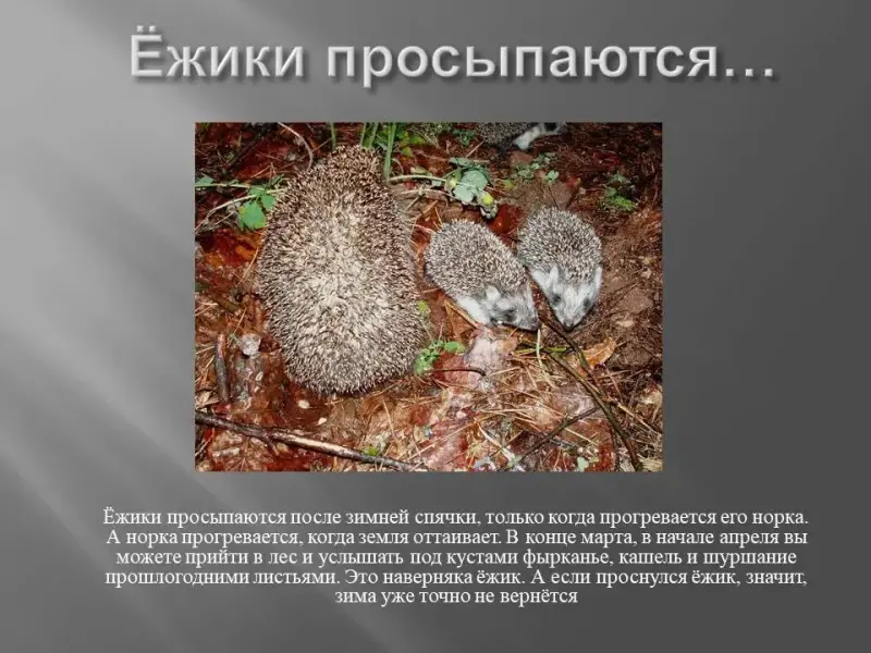 Учащиеся. Ёжики просыпаются после зимней спячки, только когда прогреваются их норки. А норки прогреваются, когда земля оттаивает. В конце марта - начале апреля вы можете прийти в лес и услышать под кустами фырканье, кашель и шуршание прошлогодними листьями. Это наверняка ёжик. А если проснулся ёжик, значит, зима уже точно не вернётся