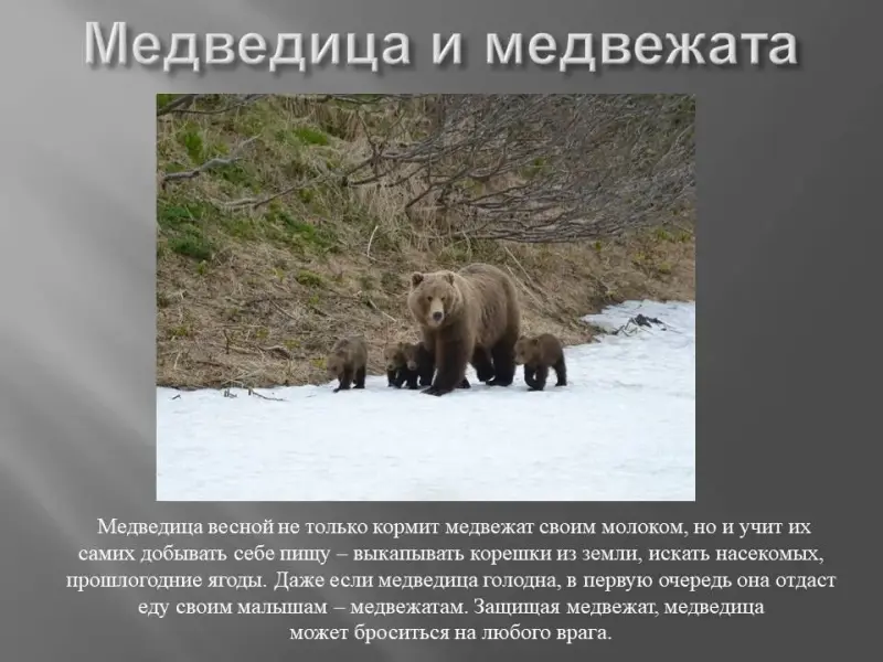 Учитель. Поговорим о том, как животные относятся к своему потомству. Медведица весной не только кормит медвежат своим молоком, но и учит их самих добывать себе пищу - выкапывать корешки из земли, искать насекомых, прошлогодние ягоды. Даже если медведица голодна, в первую очередь она отдаст еду своим малышам - медвежатам. Защищая медвежат, медведица может броситься на любого врага. Кто из вас расскажет о ежатах?