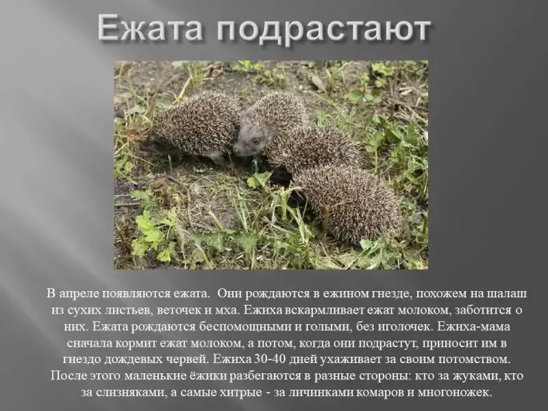 Учащиеся. В апреле появляются ежата. Они рождаются в ежином гнезде, похожем на шалаш из сухих листьев, веточек и мха. Ежиха вскармливает ежат молоком, заботится о них. Ежата рождаются беспомощными и голыми, без иголочек. Спустя несколько часов после рождения на коже ежат появляются бугорки, затем они лопаются, и из них выглядывают тоненькие иголочки. Потом иголочки затвердеют и превратятся в колючки. Ежиха-мама сначала кормит ежат молоком, а потом, когда они подрастут, приносит им в гнездо дождевых червей, слизней. Ежиха 30-40 дней ухаживает за своим потомством. После этого маленькие ёжики разбегаются в разные стороны: кто за жуками, кто за слизняками, а самые хитрые - за личинками комаров и многоножек. Когда подрастают грибы и созревают ягоды, ёжики питаются и ими.
