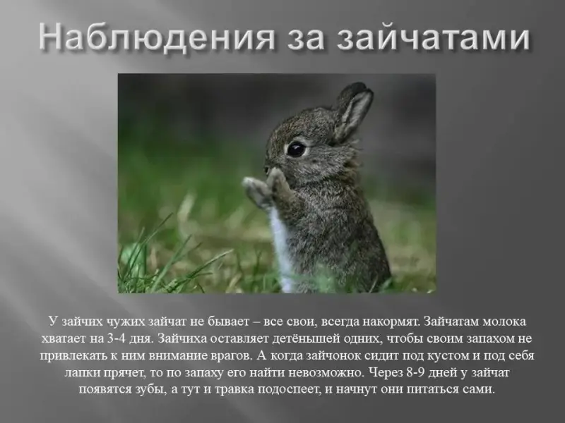 Учащиеся. Зайчиха-мама покормит зайчат и сразу же убегает, оставляя их одних под кустом. А зайчата сидят под кустиком три-четыре дня - ждут, когда их покормит новая зайчиха-мама. У зайчих чужих зайчат не бывает - все свои, всегда накормят. Молоко у зайчих жирное и питательное, зайчатам его хватает на 3-4 дня. У зайцев потовые и сальные железы находятся только на подошвах лап. И если бы зайчиха жила с зайчатами, их бы быстро нашли враги. У зайчат ведь много врагов: и лиса, и волк, и куница, и рысь, и хищные птицы. А когда зайчонок сидит под кустом и под себя лапки прячет, то по запаху его найти невозможно. Получается, что, убегая от зайчат, зайчиха их спасает. Через 8-9 дней у зайчат появятся зубы, а тут и травка подоспеет, и начнут они питаться сами.