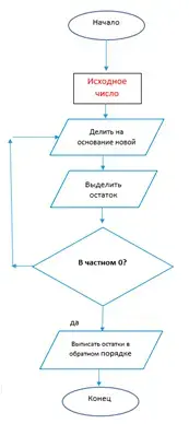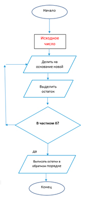 Пример: 8 класс: Перевод чисел из десятичной системы счисления в систему счисления с основанием q (на уроке строим блок-схему региня).