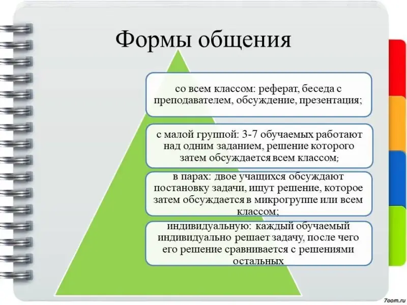 Под формами общения понимаются виды и способы группирования обучаемых на занятиях.