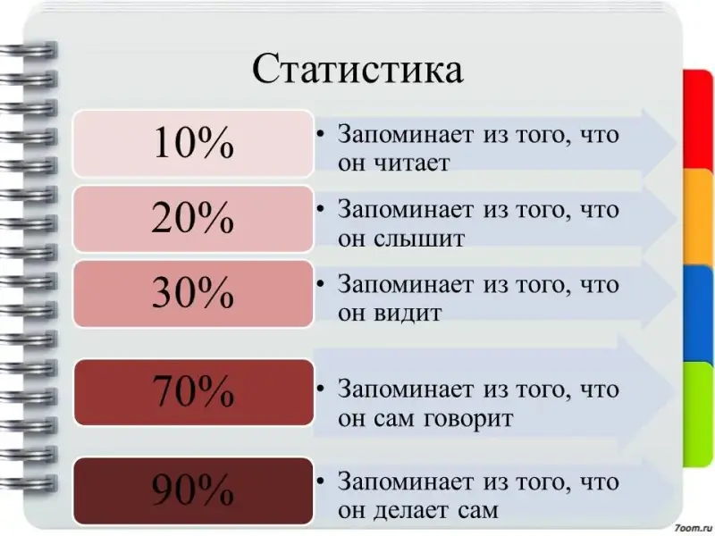 Хотелось бы также отметить, что человек запоминает только 10% из того, что он читает, 20% из того, что он слышит, 30% из того, что он видит. Но он запоминает 70% из того, что он говорит сам и 90% из того, что он сам делает [6].