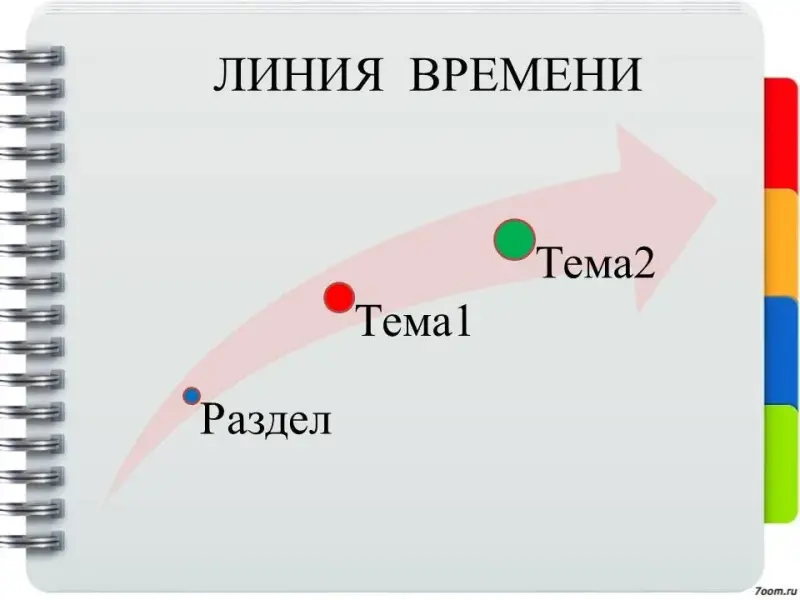 На доске линия, на которой обозначаются этапы изучения темы, формы контроля; проговариваются самые важные периоды, требующие от детей стопроцентной самоотдачи, находятся уроки, на которых можно «передохнуть». «Линия времени» позволяет увидеть, что именно может являться конечным продуктом изучения темы, что нужно знать и уметь для успешного усвоения каждой последующей темы.