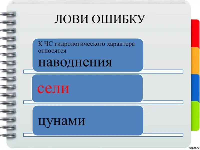 Например, (ОБЖ 7 класс): К ЧС гидрологического характера относятся наводнения, сели, цунами с описанием этих явлений.