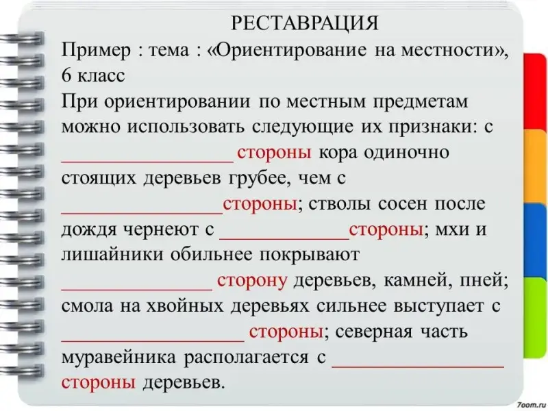 При ориентировании по местным предметам можно использовать следующие их признаки: с ________________ стороны кора одиночно стоящих деревьев грубее, чем с _______________стороны; стволы сосен после дождя чернеют с ____________стороны; мхи и лишайники обильнее покрывают ______________ сторону деревьев, камней, пней; смола на хвойных деревьях сильнее выступает с _________________ стороны; северная часть муравейника располагается с ________________ стороны деревьев.