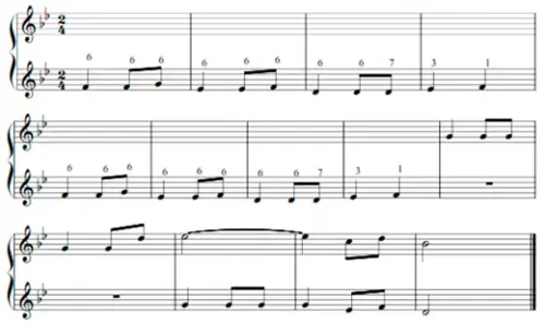 6. Опрос домашнего задания: По указанной интервальной цифровке в том же ритме постройте верхний голос, спеть 2-голосие