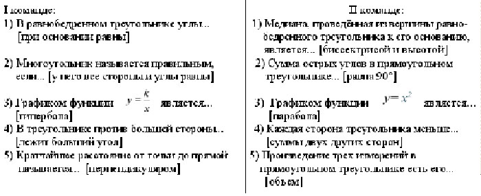 Каждой команде необходимо сформулировать следующие правила и формулы, записанные на карточках.