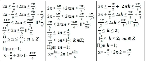 б) Рассмотрим три способа отбора корней, попадающих в отрезок