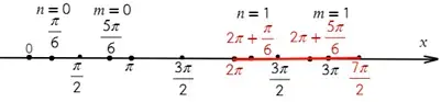 3 способ: разместим корни уравнения на числовой прямой. Сначала отметим корни, подставив вместо n, и нуль (0), а потом добавим к каждому корню периоды.