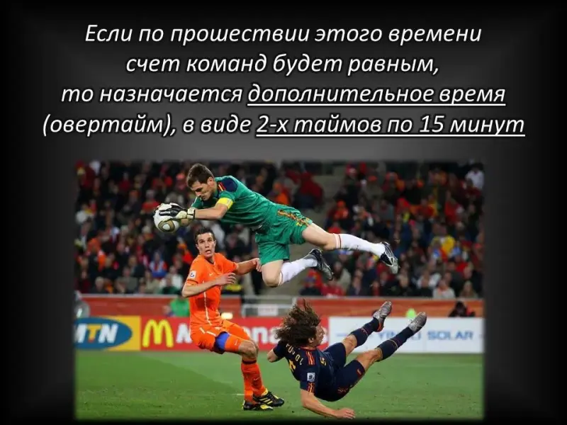 Если по прошествии этого времени счет команд будет равным, то назначается дополнительное время, в виде 2-х таймов по 15 минут.