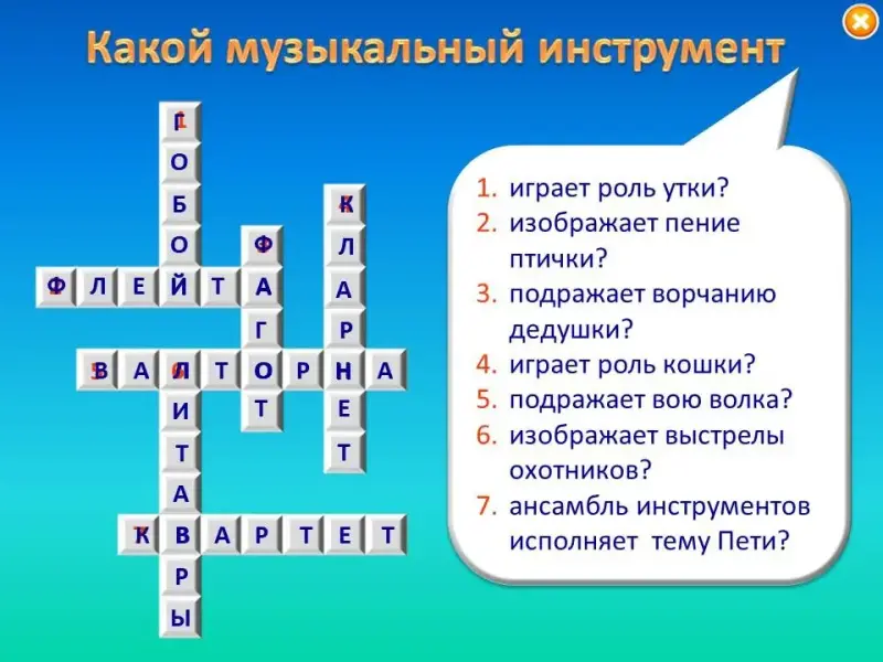 Определение персонажей по звучанию музыкальных инструментов, которые их изображают: