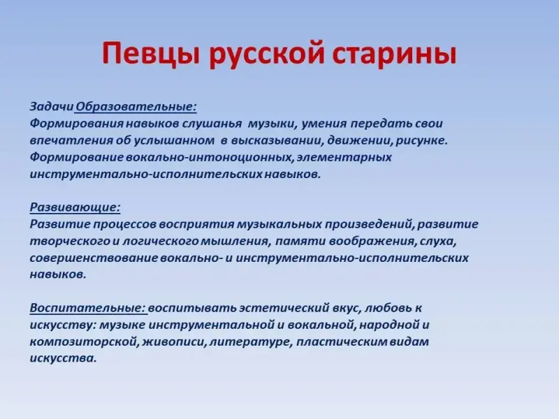 Воспитательные: воспитывать эстетический вкус, любовь к искусству: музыке инструментальной и вокальной, народной и композиторской, живописи, литературе, пластическим видам искусства. |