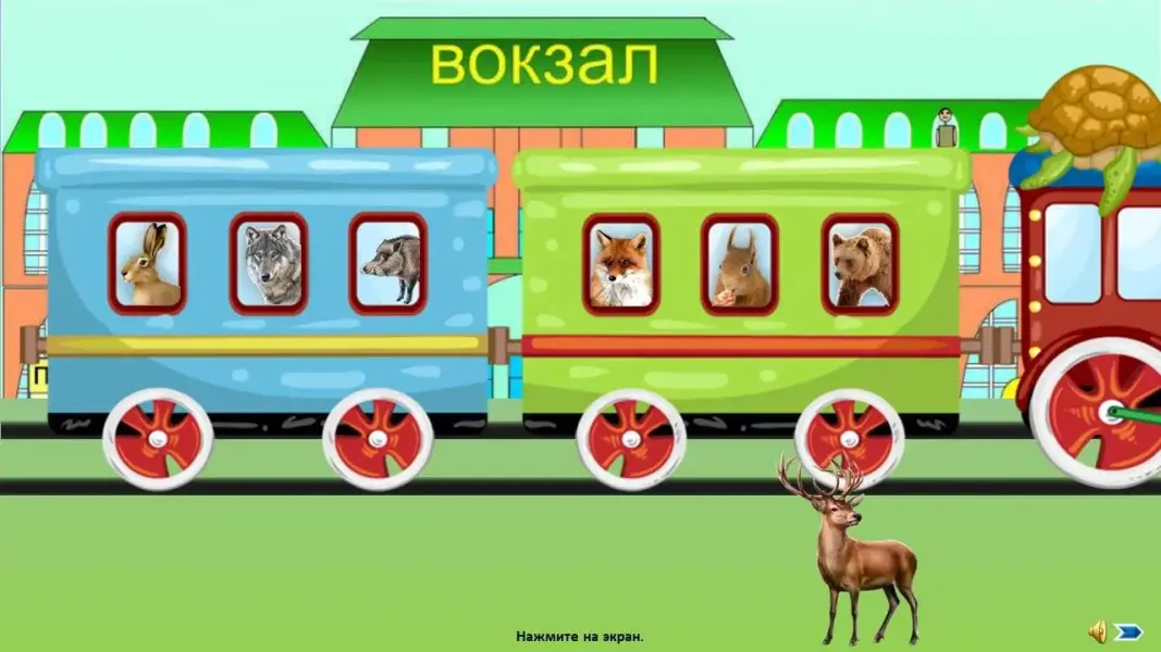 Логопед: - Посмотрите, на перроне стоит поезд. Давайте займем места в вагоне и отправимся на прогулку в лес. (Дети садятся на стульчики.)