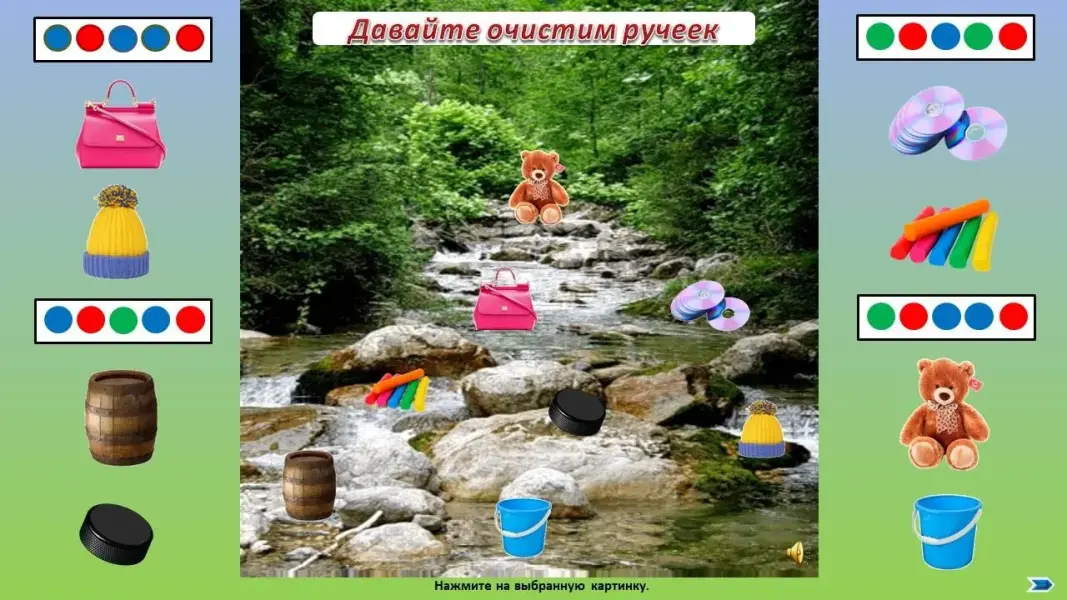 Логопед: - Смотрите, ребята, какой звонкий, веселый ручеек на нашем пути. Но вокруг столько ненужных предметов, которые засоряют его. Давайте очистим ручеек.