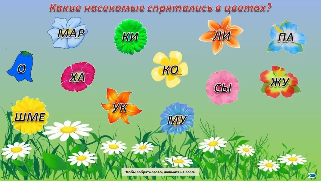 Логопед: - Какие необыкновенные цветы растут на этой опушке. В этих цветах спрятались насекомые. Давайте их найдем.
