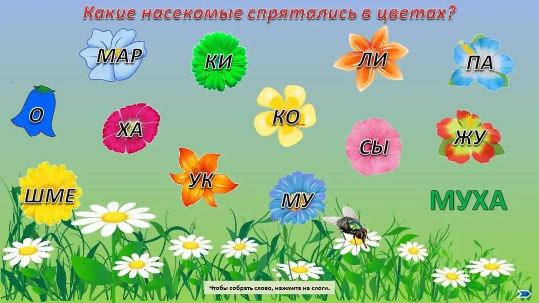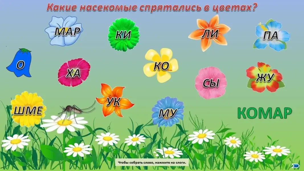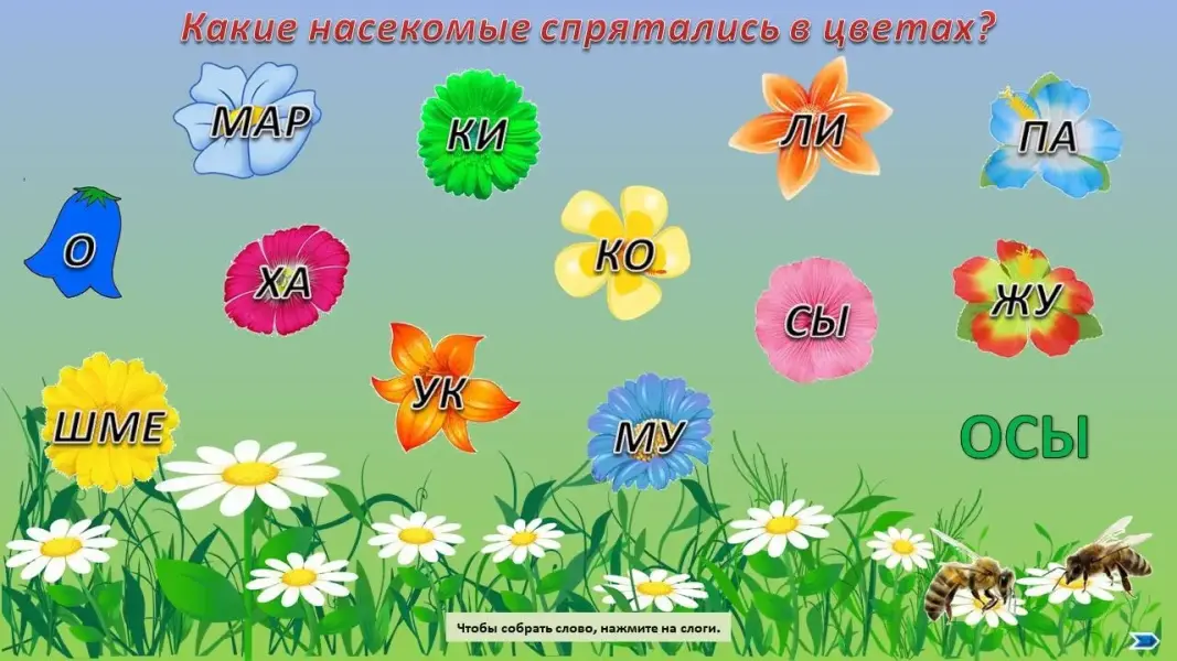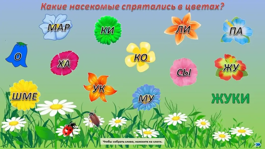 (Дети составляют из слогов названия насекомых.)