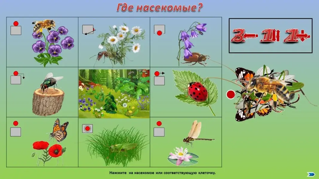 Логопед: - На этой поляне очень много насекомых. Давайте пройдем по клеточкам в указанном на карточках направлении и расскажем, где находятся насекомые. Обратите внимание на предлог, который надо употребить при построении предложения. (Предлог указан на схеме.)