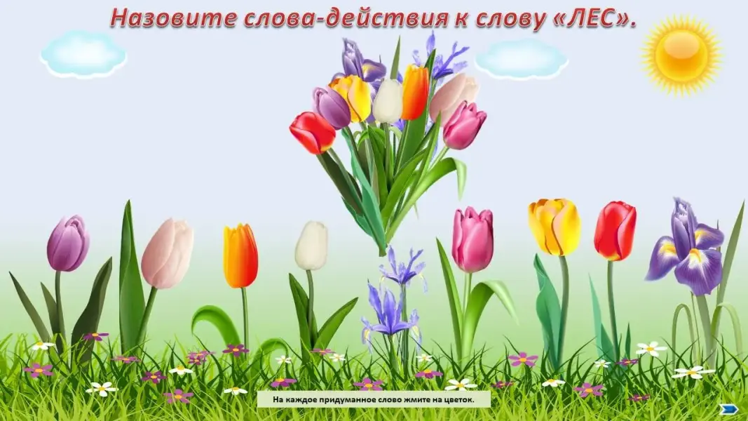 Логопед: - Нам пора возвращаться. Давайте скажем «красивые» слова о лесе и соберем букет. Лес какой?