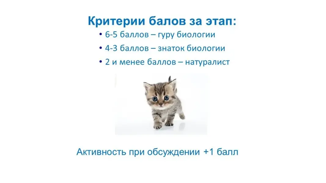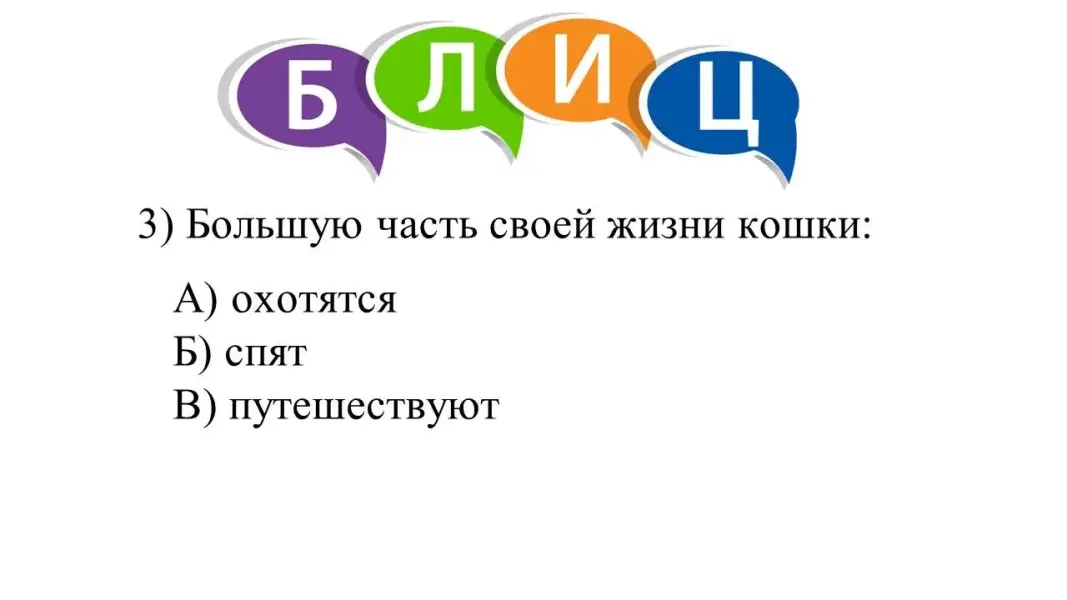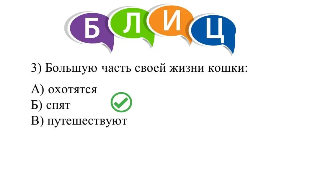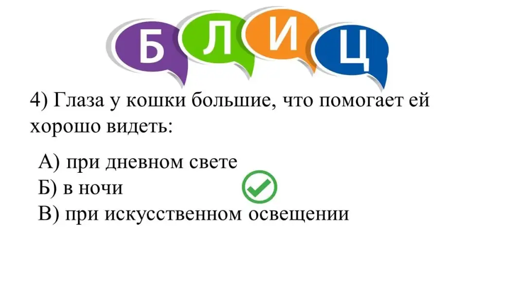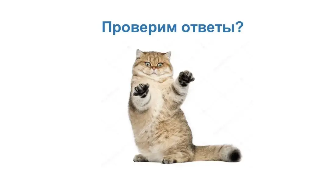 Предъявление ответов, проверка по слайду, объяснение ошибок с точки зрения биологии кошек как представителей отряда Хищных млекопитающих (с учётом возраста питомца).