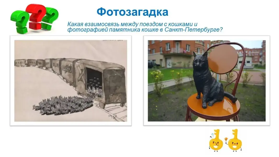 2 этап - Фотография. Команда получает лист с двумя фотографиями и задание (Приложение 5): Посмотрите внимательно на фотографии. Подумайте и запишите свою версию ответа на вопрос: Какая взаимосвязь между поездом с кошками и памятником кошке на улице Композиторов в Санкт-Петербурге? Представление ответа: Памятник кошкам был поставлен в 73-ю годовщину Победы в Великой Отечественной войне, в честь животных, которые внесли свой неоценимый вклад в защиту