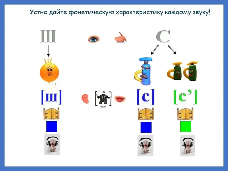 - Послушайте слова, определяйте какой звук, [с] или [ш], есть в каждом слове и место, на котором он находится (считай звуки по пальцам или по линейке).
