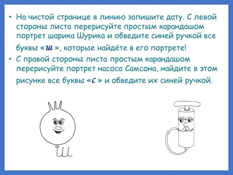 Над буквой «ш» красной ручкой рисуйте овал (форма губ на звук [ш]), а над буквой «с» - улыбку!