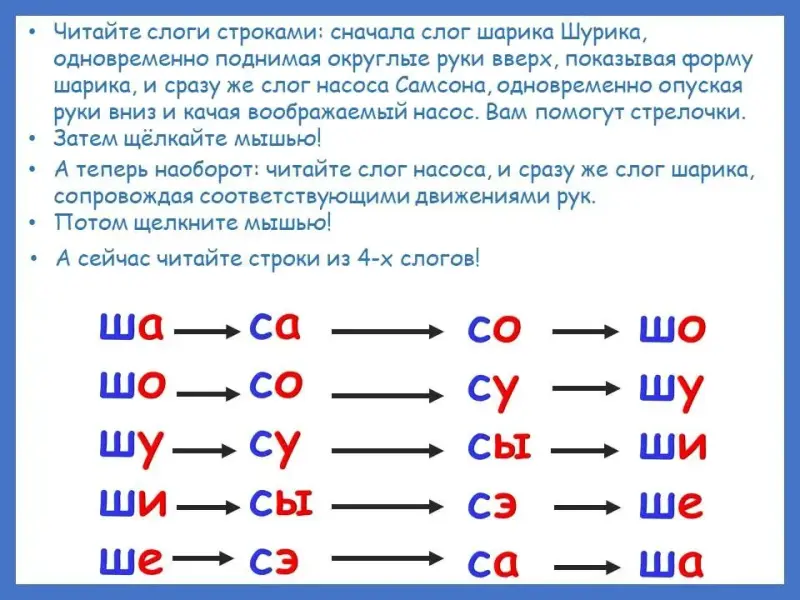 - Читайте слоги строками: сначала слог шарика Шурика, одновременно поднимая округлые руки вверх, показывая форму шарика, и сразу же слог насоса Самсона, одновременно опуская руки вниз и качая воображаемый насос. Вам помогут стрелочки: ша - са, шо - со…