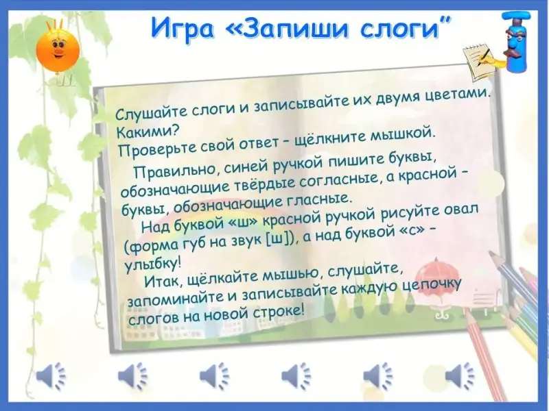 Нажмите на кнопку звука, слушайте слоги и слова, меняйте звуки и говорите, что у вас получилось, например: слышите слог ша - отвечаете са, слышите слово сутки - отвечаете шутки….