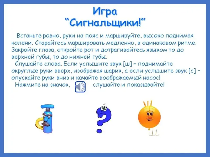 Слушайте слова. Если услышите звук [ш] - поднимайте округлые руки вверх, изображая шарик, а если услышите звук [с] - опускайте руки вниз и качайте воображаемый насос!