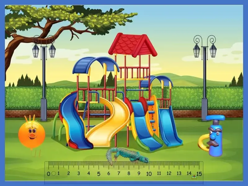 Рядом с кинотеатром была детская площадка. Перед горками сидел шипохвост и задумчиво смотрел на большую линейку. Он очень обрадовался появлению Шурика и Самсона и предложил им поиграть в игру "Найди своё место!" (Слайд 25)