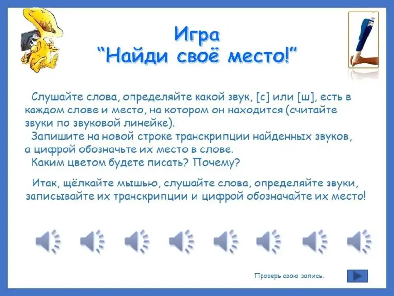 Итак, щёлкайте мышью, слушайте слова, определяйте звуки, записывайте их транскрипции и цифрой обозначайте их место!