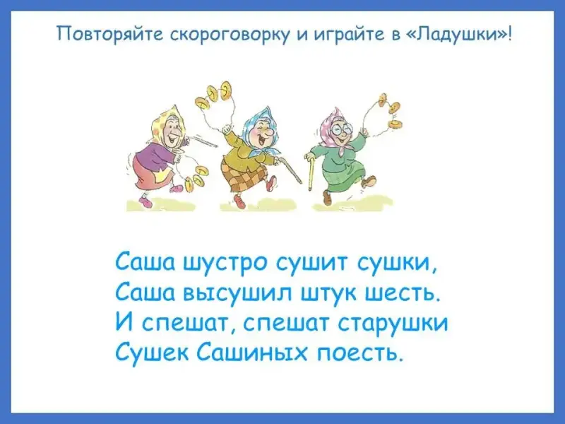 После зоопарка шарик и насос вернулись на площадку, но к тому времени шипохвост, забрав линейку, убежал по своим делам. Вдруг к площадке подбежали старушки, радостно размахивая связками сушек. Они увидели Шурика и Самсона, поздоровались и предложили им поиграть в старинную игру «Ладушки» (Слайд 29)