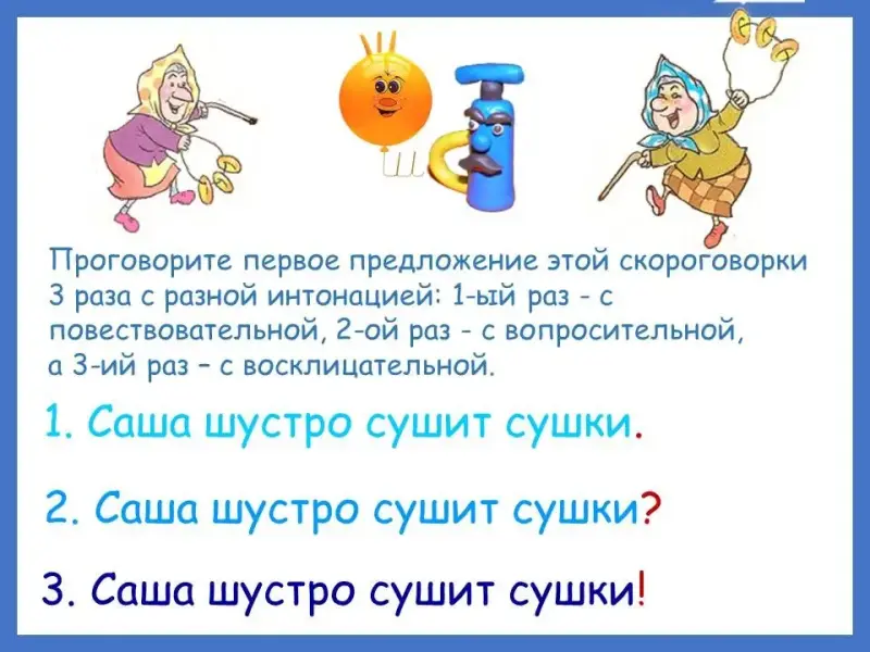 Проговорите первое предложение этой скороговорки 3 раза с разной интонацией: 1-й раз - с повествовательной, 2-й раз - с вопросительной, а 3-й раз - с восклицательной. (Слайд 31)